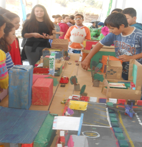 Após a confecção dos materiais, fizeram a junção dos trabalhos realizados e juntos formaram um local representando uma cidade com os estabelecimentos principais: hospital, igreja, delegacia, aeroporto, escola, mercados, lojas, farmácia... identificados em Inglês.