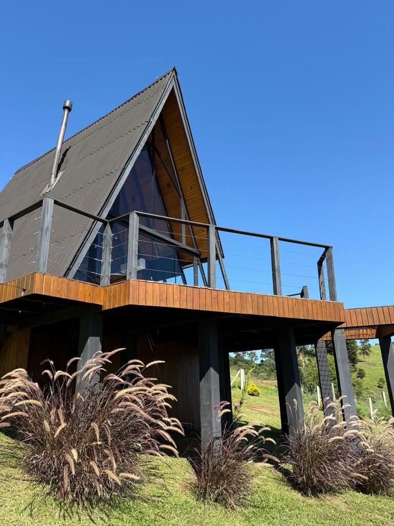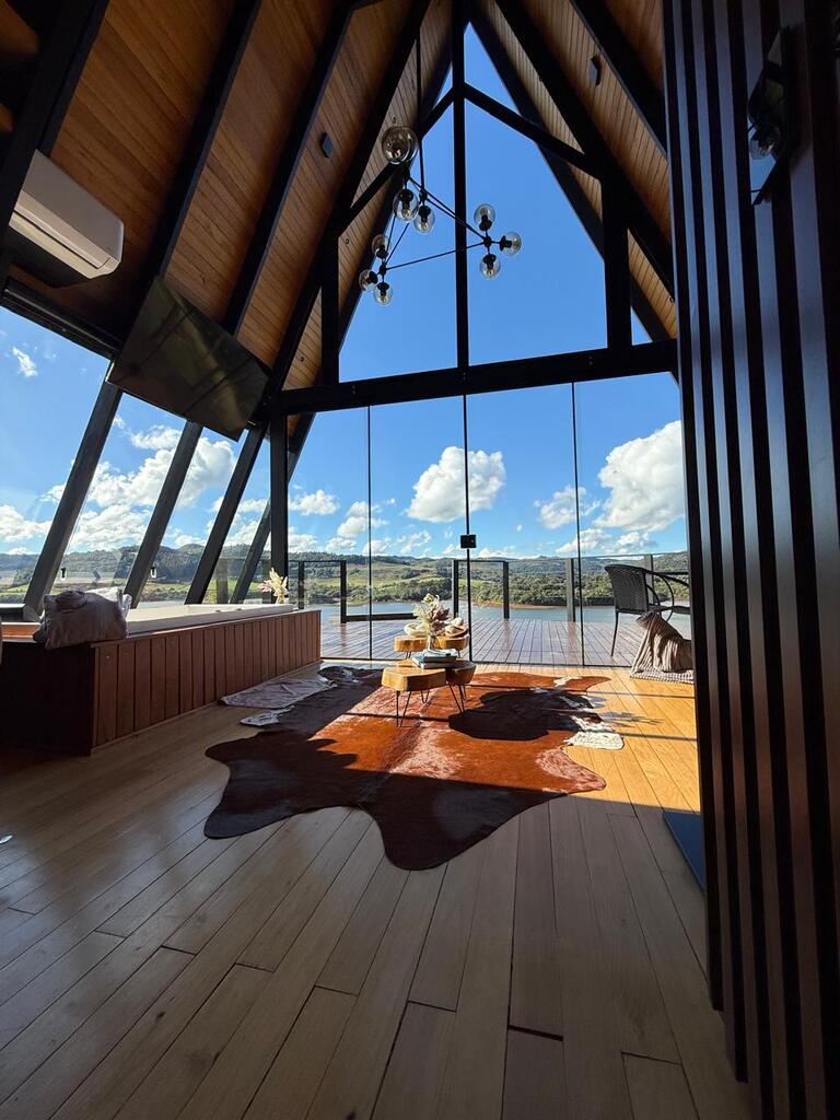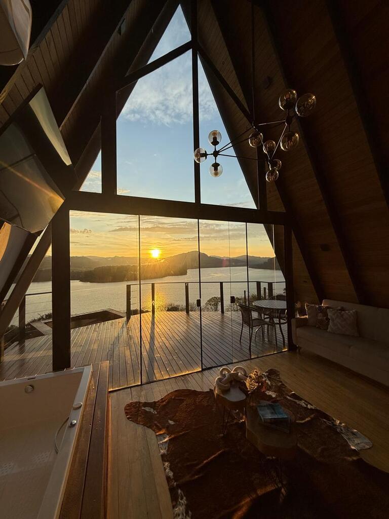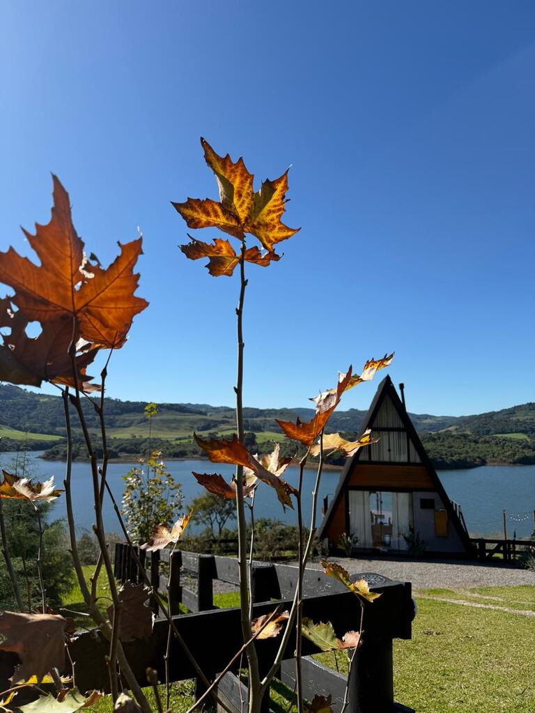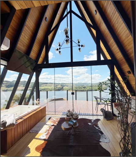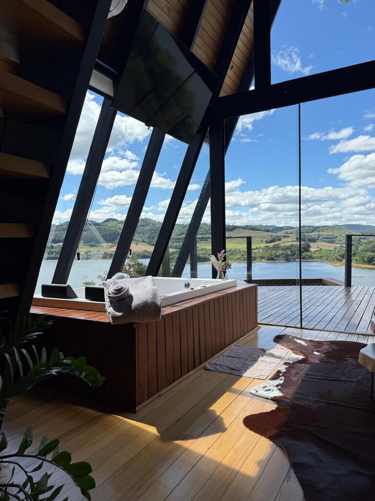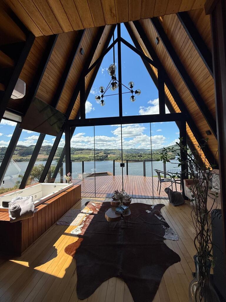 Um refúgio para casais, uma cabana no estilo A-frame com uma vista deslumbrante para o lago. Foi pensada para que os visitantes possam se desconectar da rotina do dia a dia e formar boas memórias em conexão com a natureza.