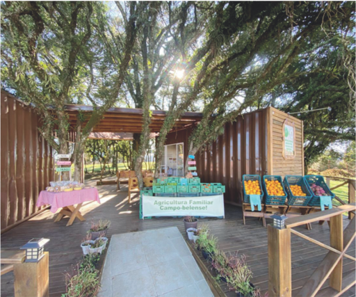 No local são comercializados verduras, hortaliças, frutas, legumes, panificados, geleias, produtos processados em agroindústrias familiares e artesanatos. Trabalham com tábuas e cestas com produtos coloniais.