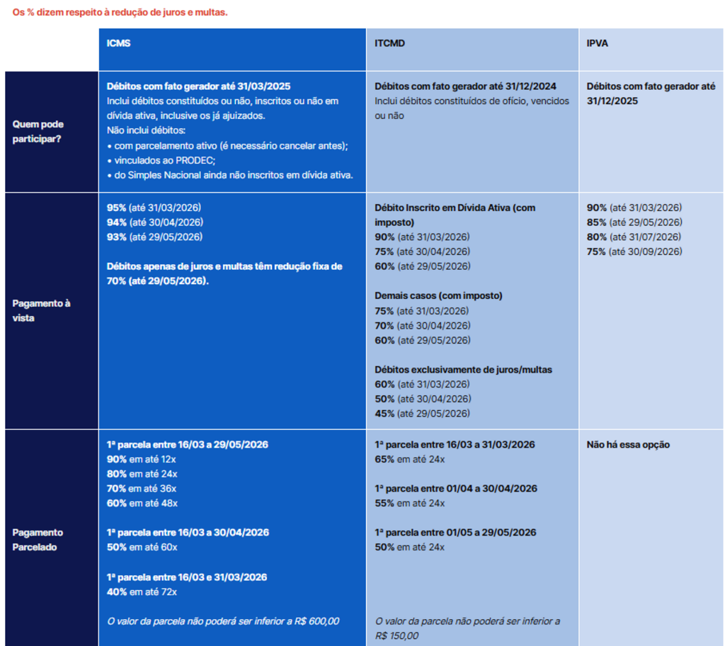 Os contribuintes poderão obter descontos expressivos sobre juros e multas, que chegam a até 95% no caso do ICMS, além de opções de parcelamento que podem alcançar até 72 vezes.