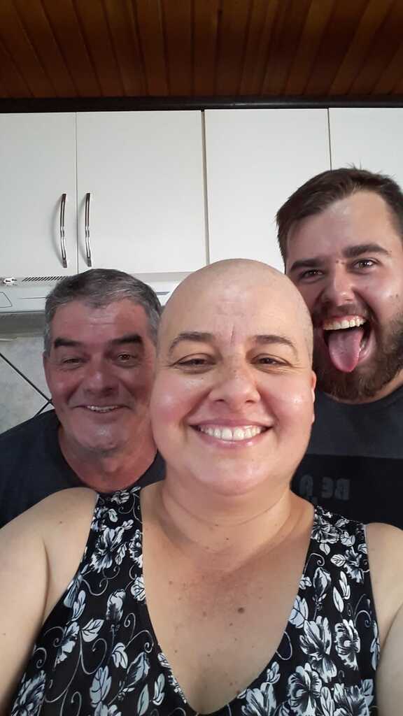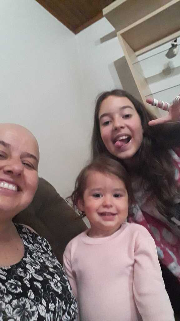 Mari – Eu procurei encarar de uma forma bem leve, me divertia com a minha careca, brincava com elas e desde raspar o cabelo, quem me ajudou foi a minha filha mais velha, e a pequena adorou a minha careca, mas acho que pelo fato de levar de uma forma mais leve, por mais que tenham sentido a minha falta durante as quimios, a gente fica um pouco ruim, sempre busquei estar o mais presente possível.