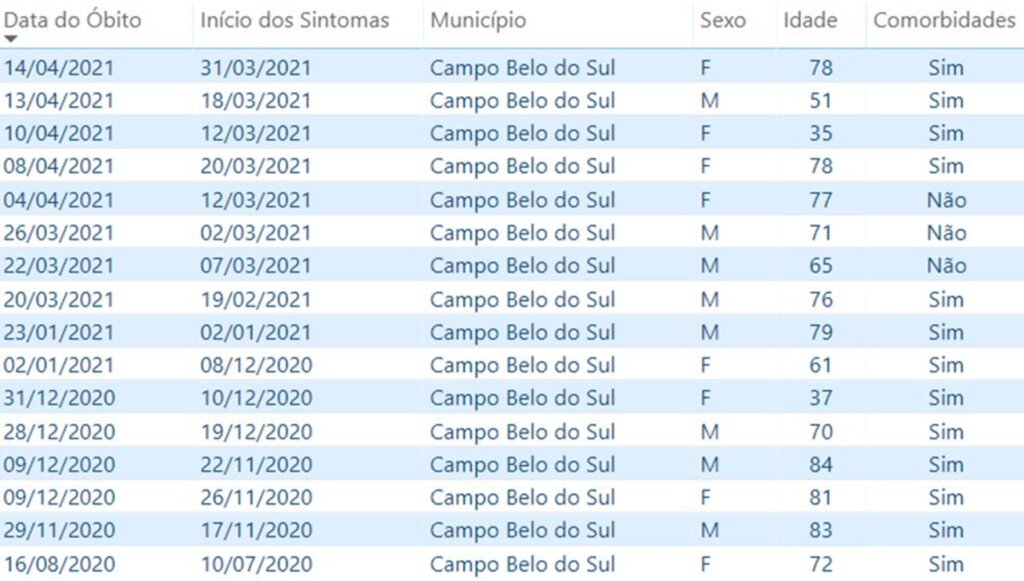 CAMPO BELO - Acessando os dados dos perfis das vítimas fatais da Covid-19 em Campo Belo do Sul, se observa que apenas três das 16 mortes analisadas não possuíam comorbidades (doenças pré-existentes). A vítima fatal mais jovem foi uma senhora de 35 anos. E o mais idoso, um cidadão que somava 84 anos. A ampla maioria tinha 70 anos ou mais e, se considerar a vítima fatal que não consta no gráfico abaixo, infelizmente, temos o mês de abril como o mais perverso em termos de óbitos. Morreram seis campo-belenses em abril. A mesma quantidade de mortes durante todo o ano de 2020.