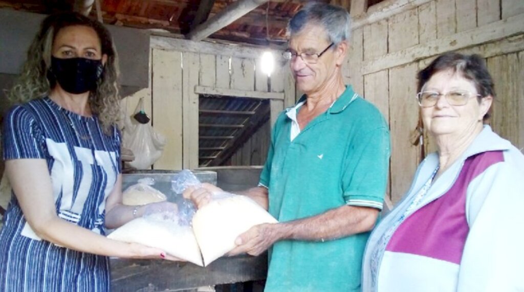 Secretária Márcia Surdi e a produção na mão com João Bonato e dona Inês no moinho da localidade de Laje de Pedra em Celso Ramos
