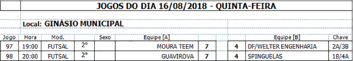 Jogos do dia 16/08/2018 e 19/08/2018 e programação