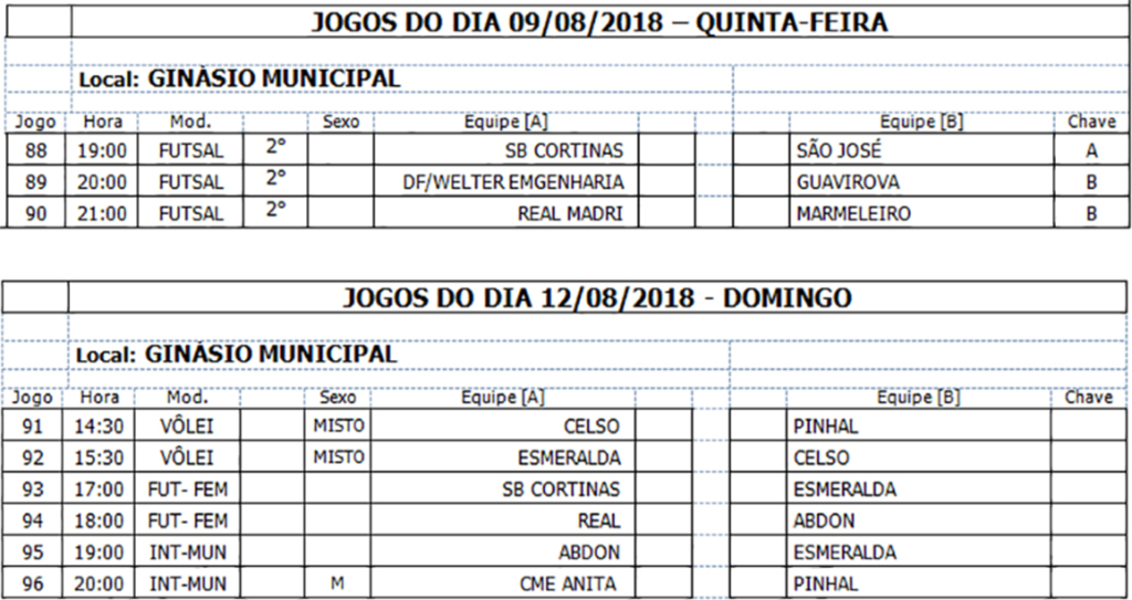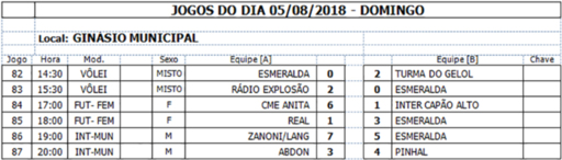 Jogos do dia 05/08/2018 e programação