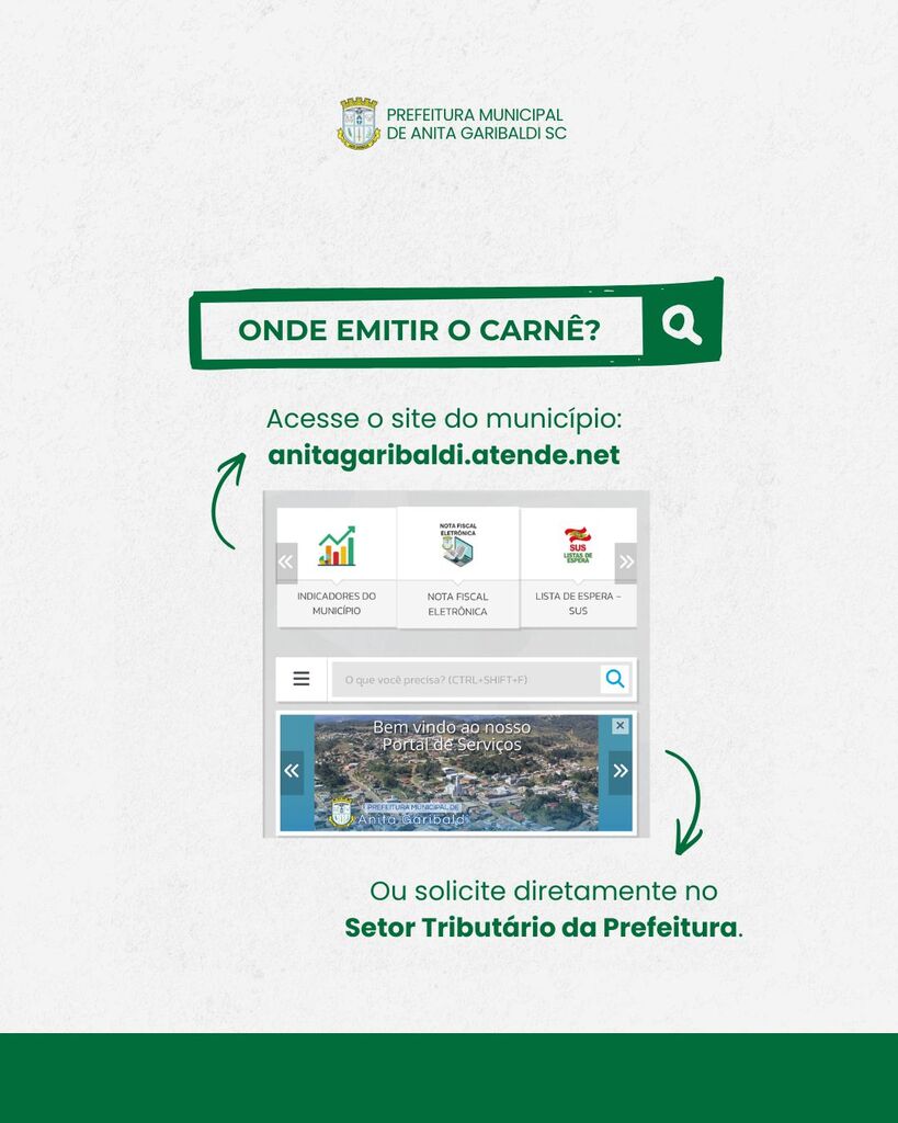 Os contribuintes podem acessar o portal da Prefeitura de Anita Garibaldi e realizar a consulta utilizando os dados do imóvel ou do proprietário. Após o acesso, é possível visualizar, baixar e imprimir o carnê para pagamento.