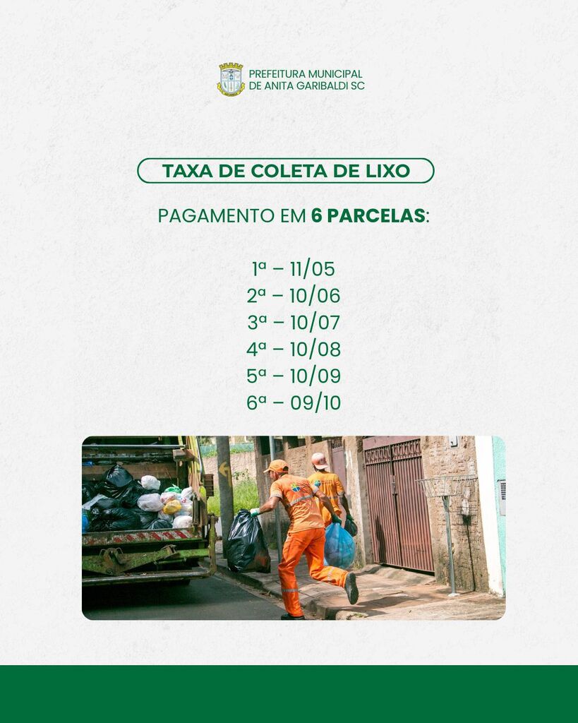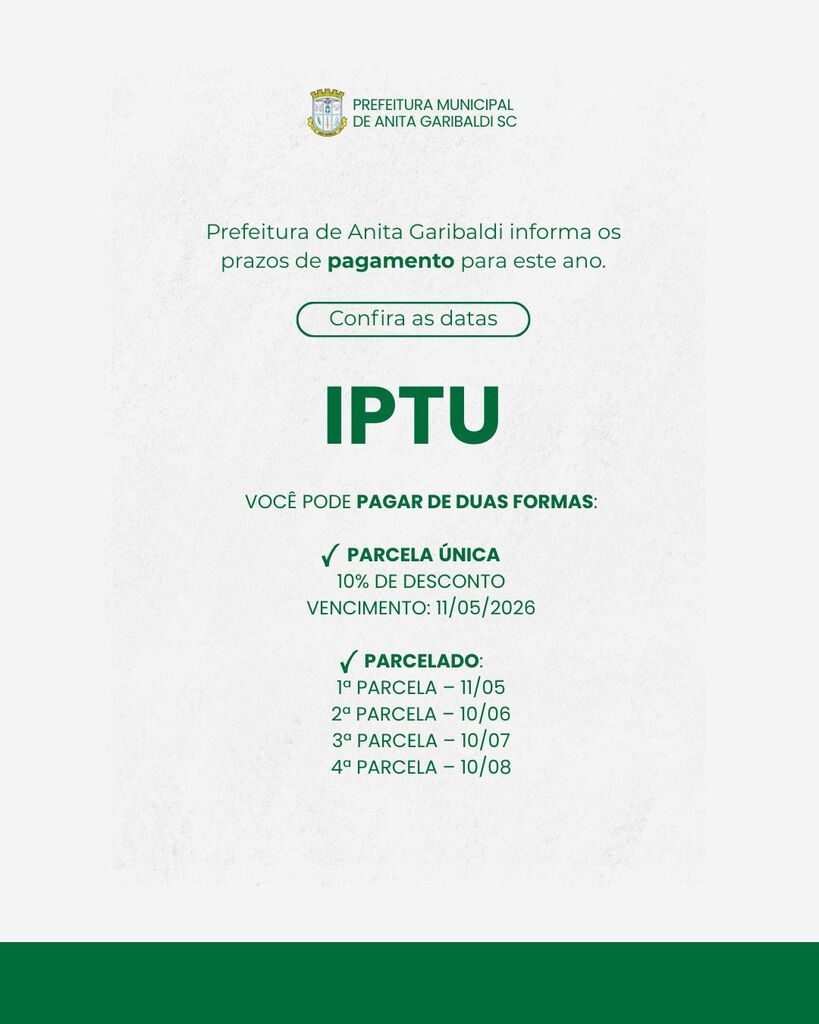 A Prefeitura de Anita Garibaldi informa que os carnês do Imposto Predial e Territorial Urbano (IPTU) e da Taxa de Coleta de Lixo referentes ao exercício de 2026 já estão disponíveis para emissão e impressão no site oficial do município.